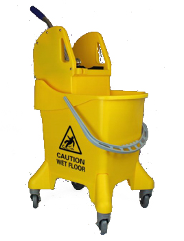 Carro de limpeza amarelo c/ 4 rodas giratórias e prensa. Ergonómico e resistente.